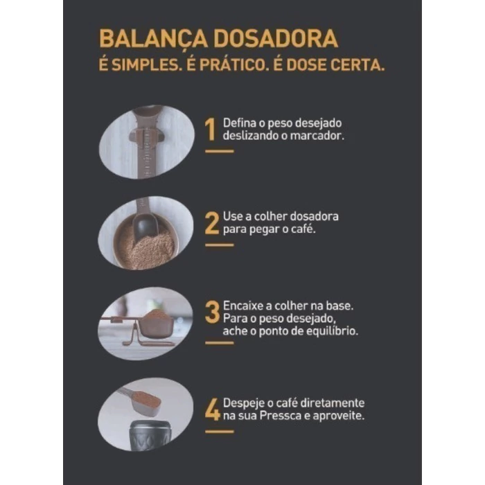 Fácil de usar, permite que o café, em grãos ou em pó, seja retirado direto da embalagem, pesado e usado no preparo ou moagem. Além de prática é portátil e fácil de levar com sua Pressca para preparar café em qualquer lugar.